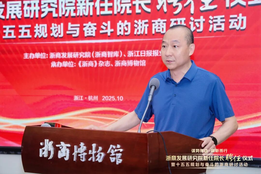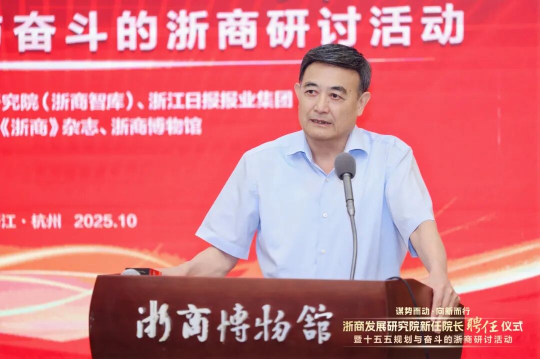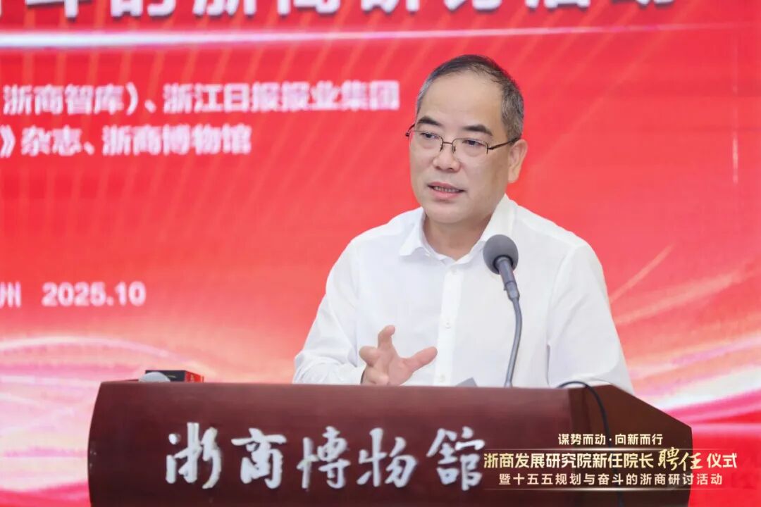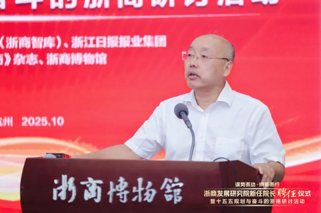 “谋势而动向新而行——浙商发展研究院新任院长聘任仪式暨‘十五五’规划与奋斗的浙商研讨活动”,10月12日在浙商博物馆举行。会议由浙商发展研究院(浙商智库)、浙江日报报业集团主办,《浙商》杂志、浙商博物馆承办。与会代表共同探讨“十五五”机遇,锚定浙商新路径,携手助力新时代浙商发展。十二届省人大副主任王永昌,十二届省政协副主席周国辉,浙江工商大学党委书记郁建兴,浙江日报报业集团总编辑李杲,浙江省社科联主席盛世豪,浙江省社科院院长查志强,浙江工商大学发展委员会主席、浙商研究院院长陈寿灿,万丰奥特集团董事局主席陈爱莲、中南集团董事长吴建荣、万事利集团董事长屠红燕、海亮集团董事长王黎红,浙商研究院执行副院长、浙商博物馆馆长杨轶清等出席会议。会上周国辉受聘担任浙商发展研究院院长。