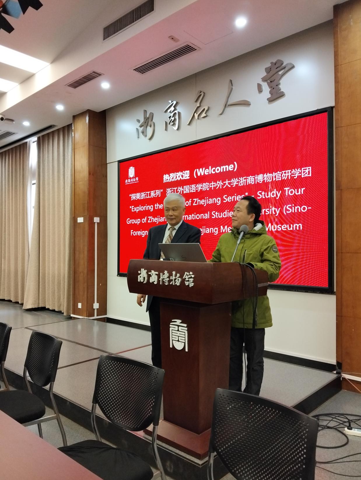 参观结束后,学生们在浙商博物馆多功能厅聆听了王教授关于浙商精神的专题分享,亚太地区小水电研究培训中心潘大庆主审,外事与培训处长(已退休)D. Pan, Chief(retired),Div of Foreign Affairs & Training, Hangzhou Regional Center (Asian-Pacific) for Small Hydropower,浙江正于和律师事务所 合伙人 汤国柱律师,Tang Guozhu, Partner, Zhejiang Zhengyuhe Law Firm,