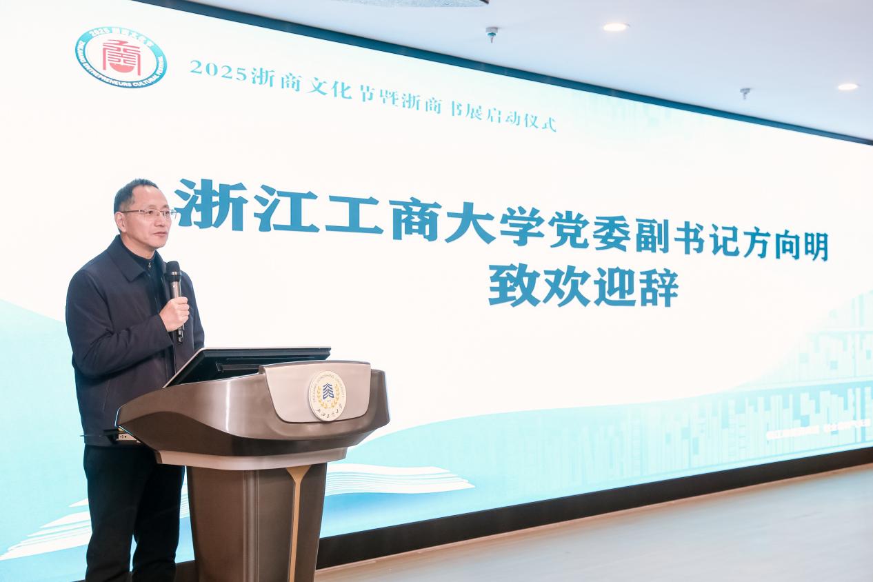 浙江工商大学党委副书记方向明致欢迎辞。他感谢各界嘉宾长期以来关心支持学校发展、助力浙商文化传承!他指出,作为一所以“商”立校、经管见长的高等学府,与浙商群体血脉相连,深耕浙商文化研究、传承与传播,建有浙商博物馆、浙商研究院等特色平台。浙商是浙江的“金字招牌”,其精神是商科教育的鲜活教材。此次文化节,既是对浙商文化的系统梳理,也是对商科人才培养路径的积极探索。希望本次文化节成为开放、包容、共享的交流平台,让学术研究和商业实践对话,让文化传承和时代发展共鸣,让青年学子能够在沉浸式文化体验中,深刻理解商业的本质,企业的责任和文化的温度。