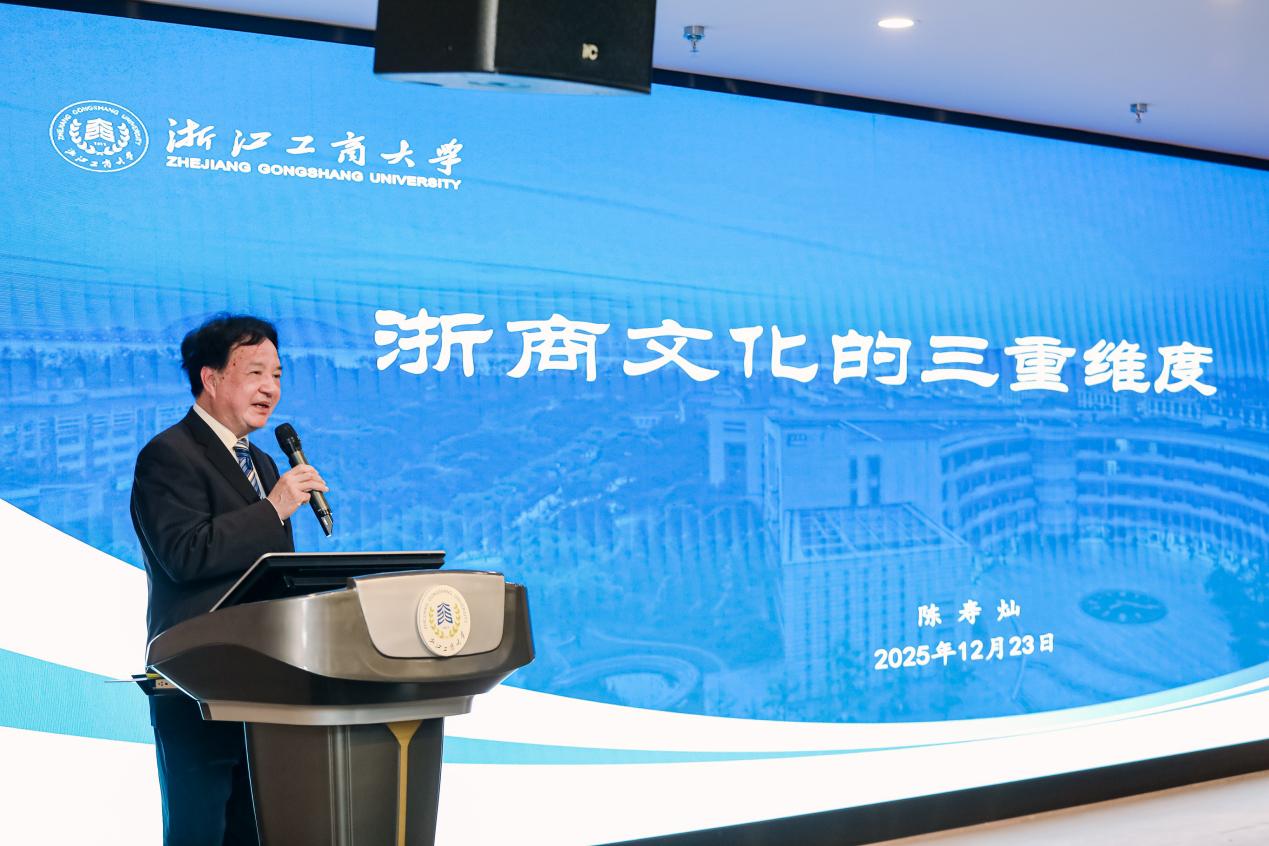 浙江工商大学浙商研究院(华商研究院)院长、浙江省政府咨询委员陈寿灿教授在演讲中分享了浙商崛起与发展背后的文化支撑,从历史、价值与实践三重维度生动阐述了浙商文化是浙商之魂。他指出,从浙商文化的历史维度看,传承了中华优秀传统文化精神和浙江地域文化的优秀基因。从价值维度看,呈现了浙学传统“理性-事功”的伦理特质,其中义利并举、知行合一、工商皆本等核心命题是浙商文化的价值底色。从实践维度看,在资源短缺、环境倒逼的陆域小省,以市场趋向的改革为引领,浙商砥砺前行,创业创新,其波澜壮阔的生动实践是浙商文化的源头活水。