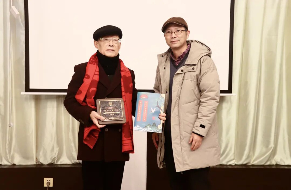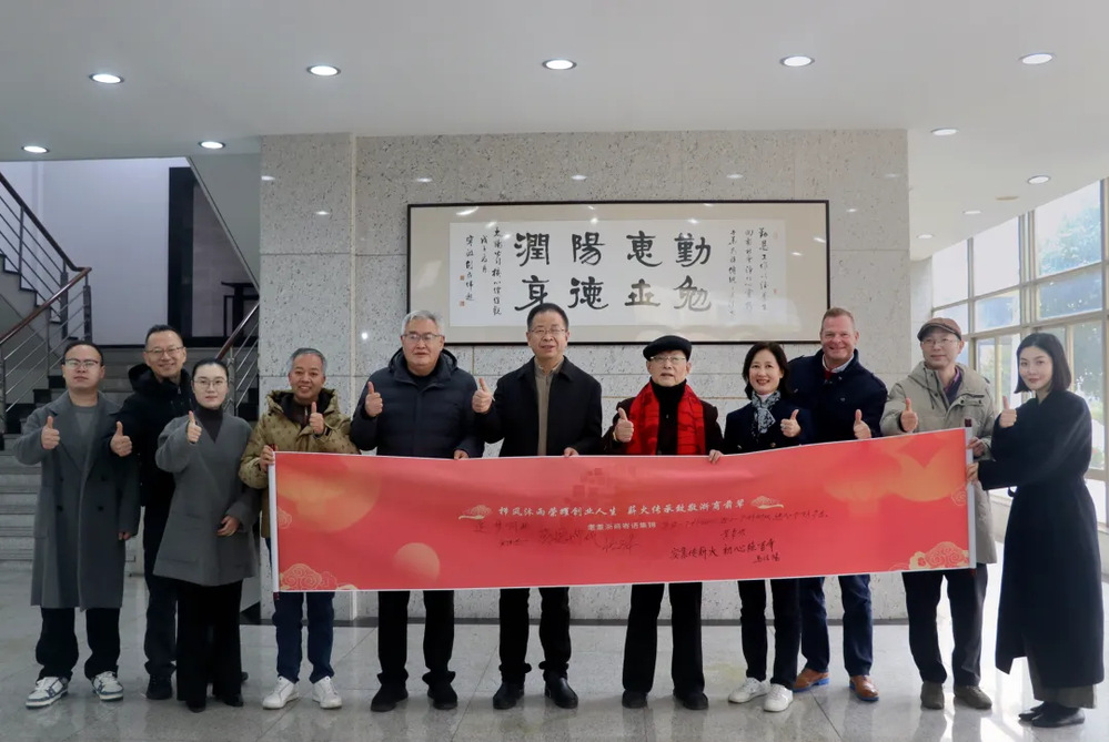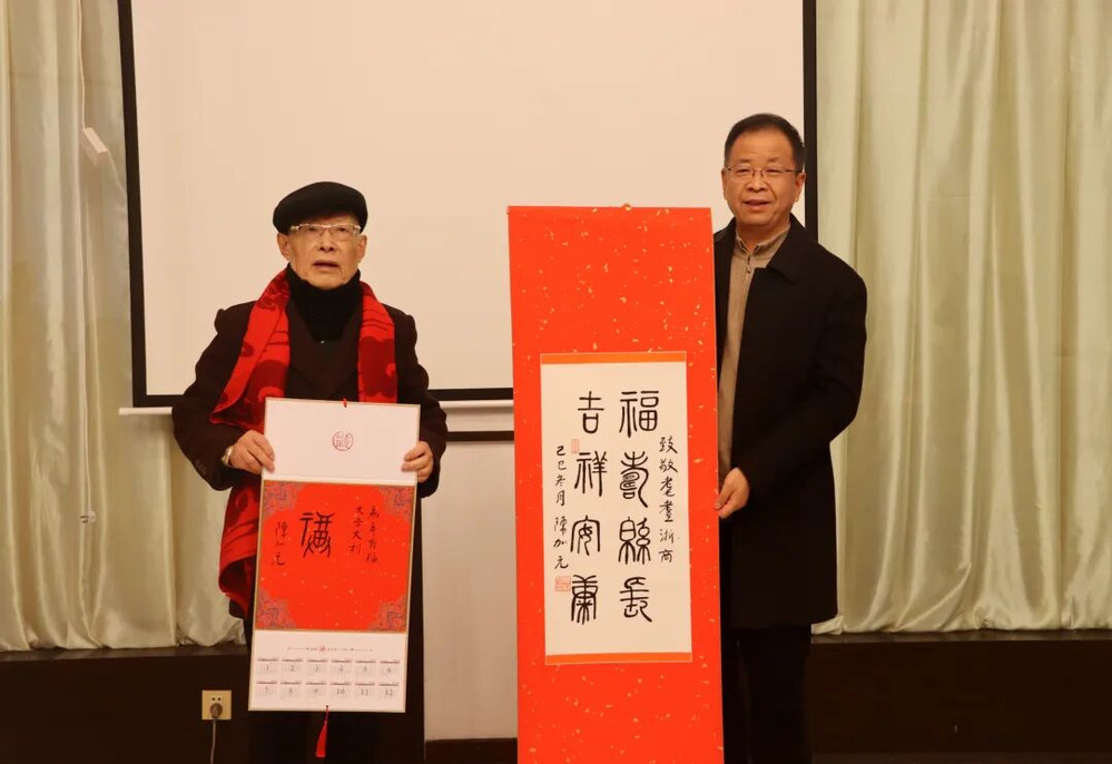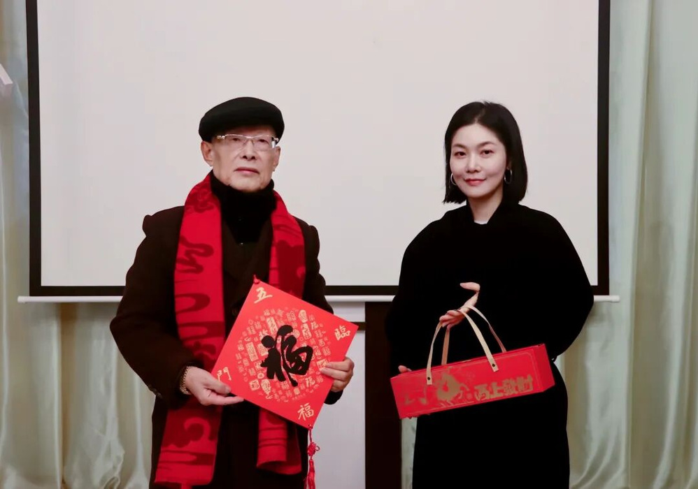 慰问现场,温馨的祝福与敬意交织。浙商博物馆馆长助理许旭为马信阳戴上红围巾,象征事业兴旺与浙商精神的代际传承;浙江工商大学浙商研究院副院长、浙商博物馆馆长杨轶清,呈上浙江省政府原副省长、省政协原副主席、党组副书记陈加元题写的书法作品及“福”字挂历,笔墨间满含对浙商前辈深耕实业的敬意与新春祝福;《浙商》杂志副总编辑黄毅赠送镌刻姓名的纪念牌,肯定其在行业内的贡献与标杆引领作用;《浙商》杂志记者施晓艳送上由浙商博物馆联合《浙商》杂志等联合出品的“五福临门·浙商新春”文创礼盒,礼盒以“福”字串联起吉利控股集团李书福、西子联合王水福、杰克控股阮福德、民生药业竺福江、云中马股份叶福忠五位名字中含“福”字的浙商标杆,凝练呈现浙商群体坚守实业、勇立潮头的精神内核。