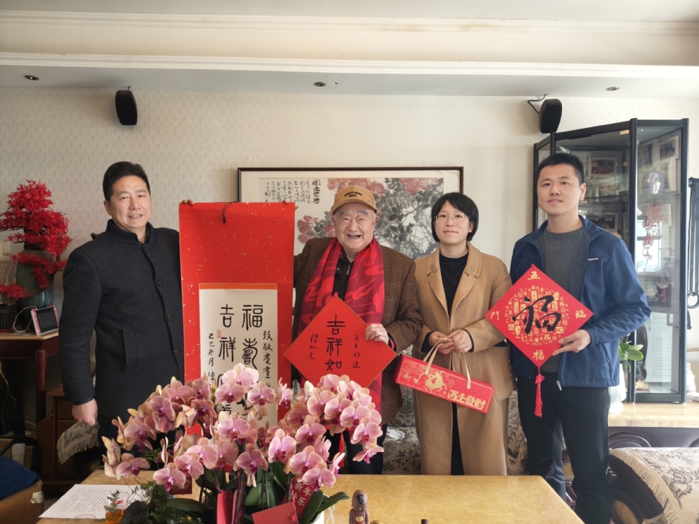 慰问团为吕士林送上敬意与纪念礼品。浙商博物馆副馆长钭卓珍献上红围巾,寓意浙商精神薪火相传;嘉兴市工商联党委委员、副主席鞠峰送上由浙江省政府原副省长、省政协原副主席、党组副书记陈加元题写的书法作品及“吉祥如意”挂历,笔墨之间饱含对浙商前辈深耕实业、锐意进取的敬意;慰问团还赠送镌刻姓名的纪念牌,致敬他为中国特种纸工业作出的卓越贡献;送上“五福临门·浙商新春”文创礼盒,礼盒以“福”字串联起吉利控股集团李书福、西子联合王水福、杰克控股阮福德、民生药业竺福江、云中马股份叶福忠五位名字中含“福”字的浙商标杆,展现浙商群体坚守实业、勇立潮头的精神内核。